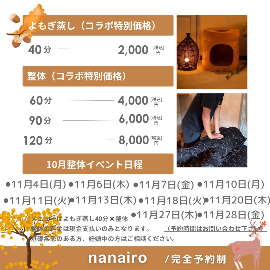 上記以外の日程は8時45分〜14時45分までの施術時間になります。