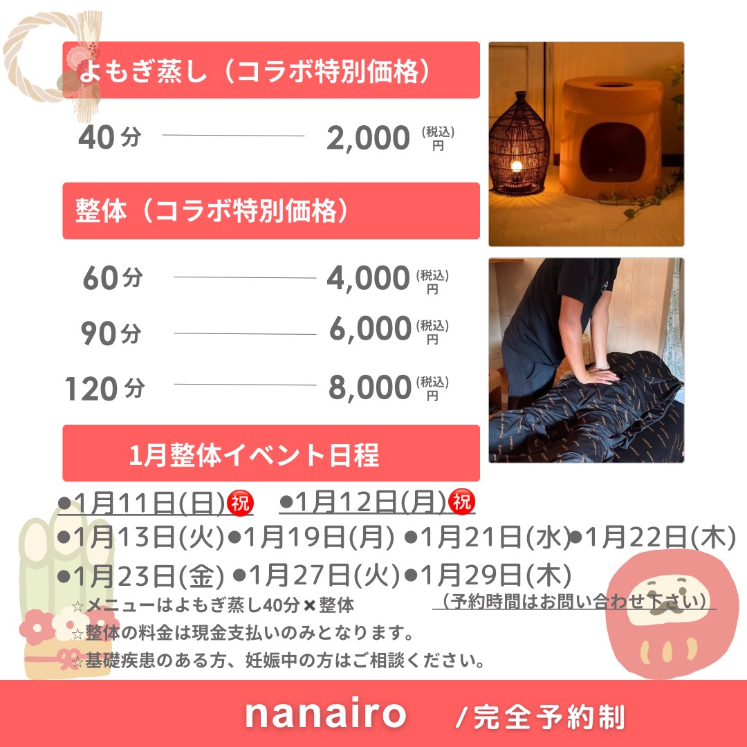 20Dec2025 1月整体 2026年1月の整体イベントの日程です✨ 年末年始の疲れや寒さで固まった体をほぐすのにぴったりです✨ 各日、お時間や設定枠が違っておりますので、ご希望の方はお問い合わせくださいませ🙏❤ 最近のお知らせ一覧お知らせ一覧 初☆福袋!! 2025.12.20 2026年1月営業日 2025.12.20 1年ぶりのご来店♡ 2025.12.20 レモンボトルでスッキリ!! 2025.12.20 1月美容鍼 2025.12.20